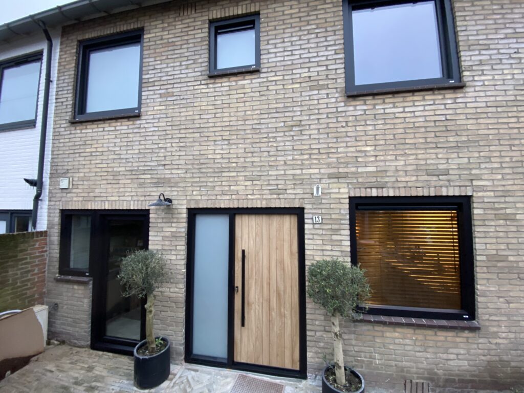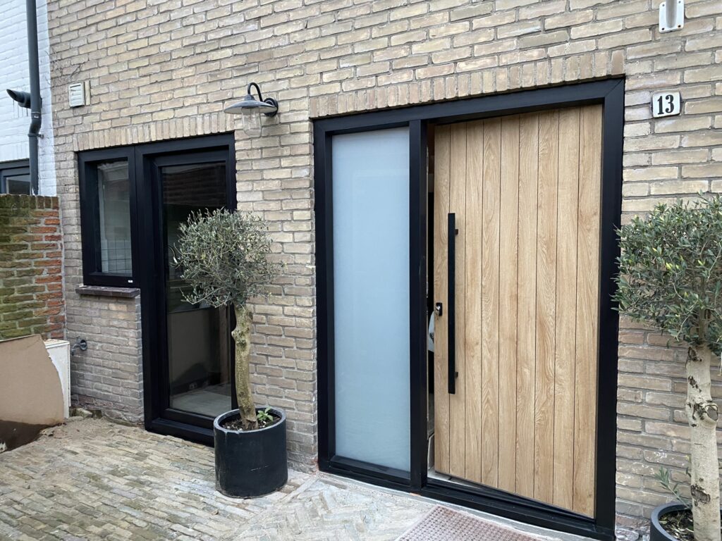 De oude, houten kozijnen zijn vervangen voor nieuwe, kunststof kozijnen. De wit en groene kleuren vervangen voor zwart, generfde kozijnen met een prachtige Turner Oak voordeurpaneel die je aandacht wel op eist!